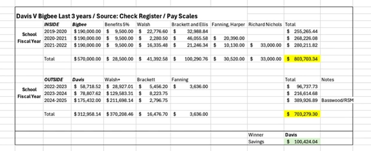 By removing all of the additional legal services you will see that despite having to pay for additional work for Basswood Elementary, RSM audit, among other things, Tim Davis has saved the district money over the last 3 years!